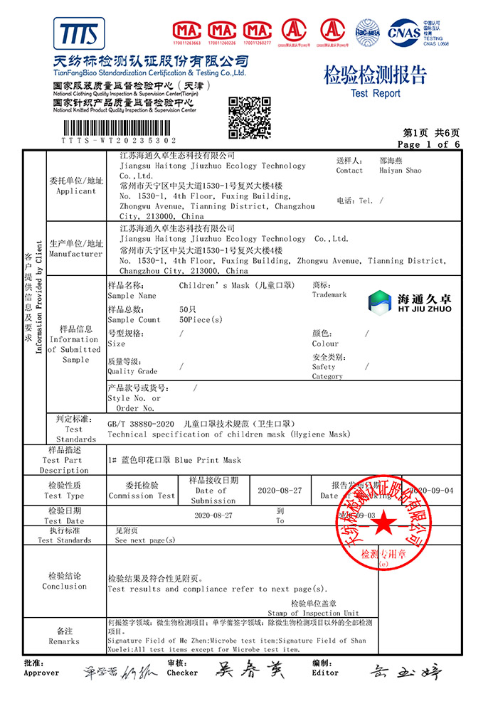 GB/T38880-2020檢測(cè)報(bào)告- 納米銅石墨烯口罩(兒童衛(wèi)生型)