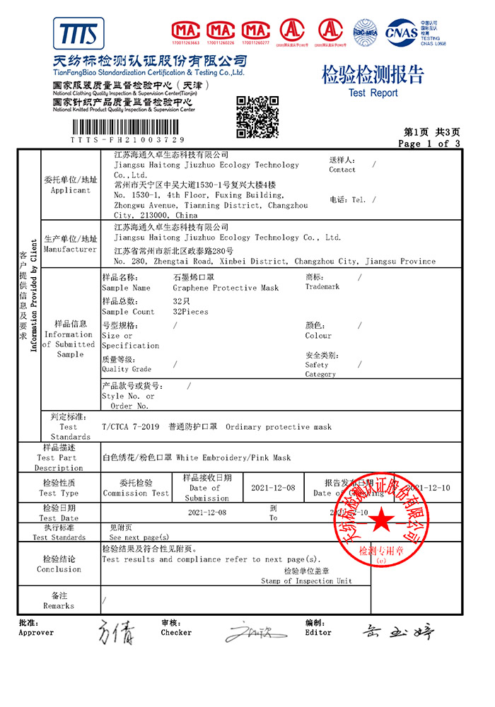 T/CTCA 7-2019檢測(cè)報(bào)告- 石墨烯口罩